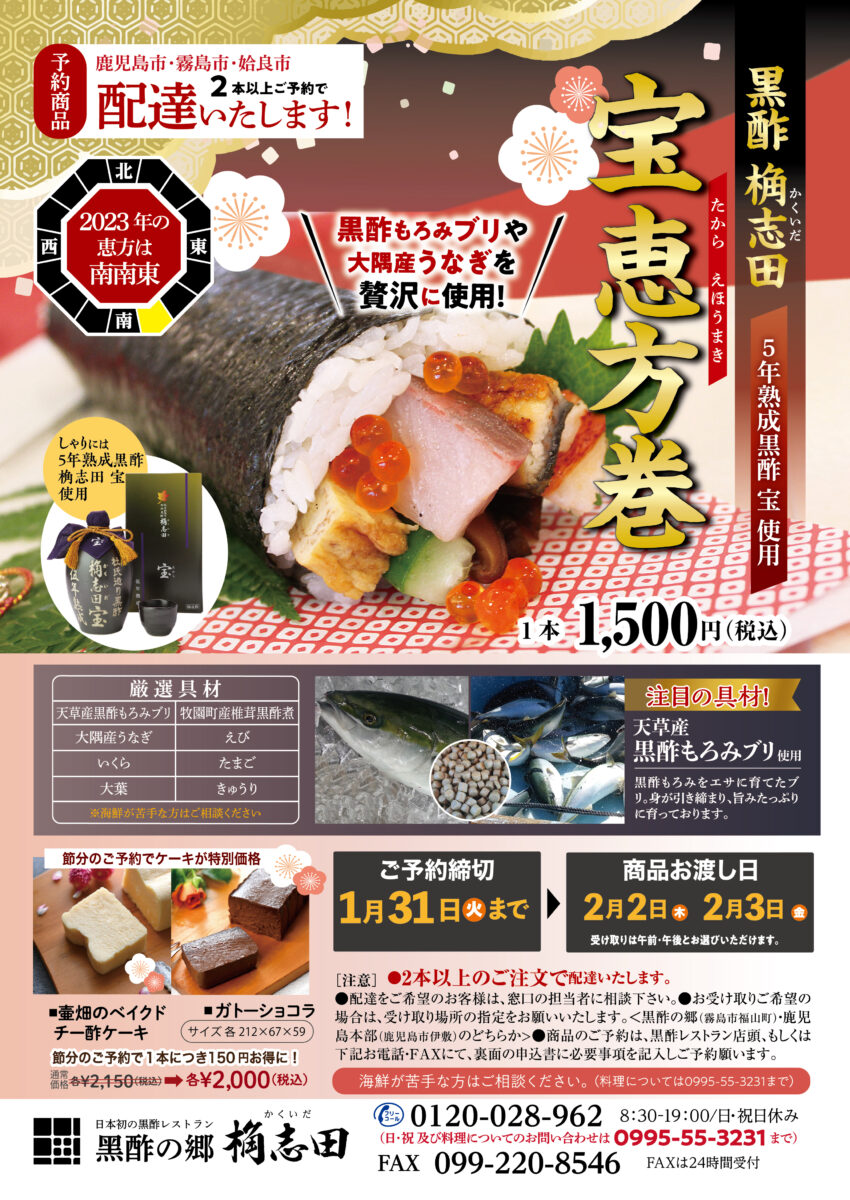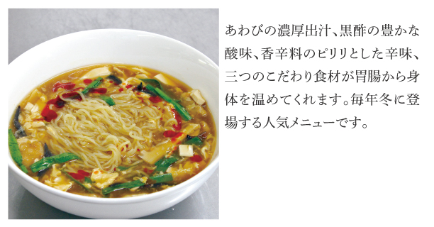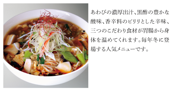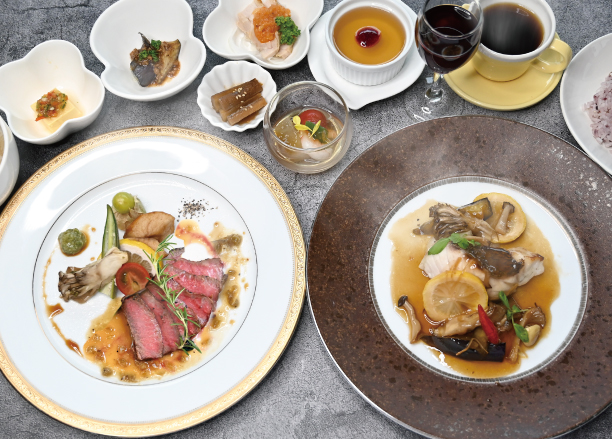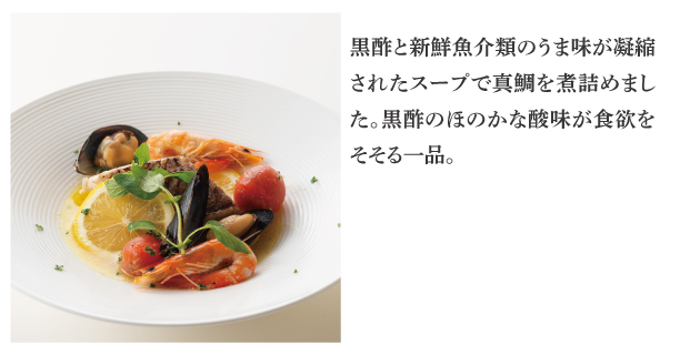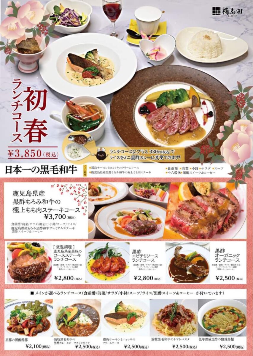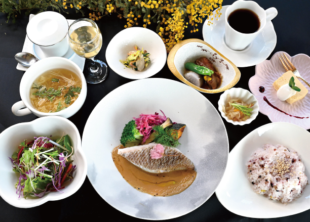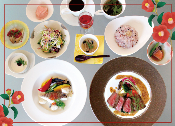 | Menu | ■食前酢 ■前菜 ■サラダ ■桷志田小鉢 ■スープ ■ライス ■黒酢スイーツ ■コーヒー ※仕入れ等の影響により、予告なしに変更になる場合がございます。ご了承くださいませ。 |