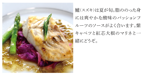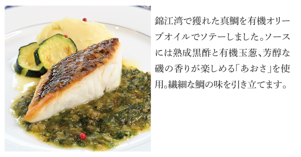 お魚は錦江湾の真鯛。有機玉葱とあおさのソースで磯の香と大地の甘さをお楽しみください。