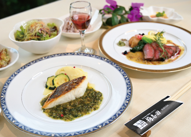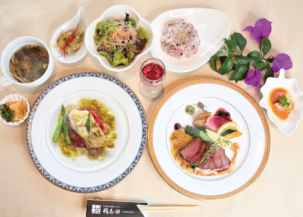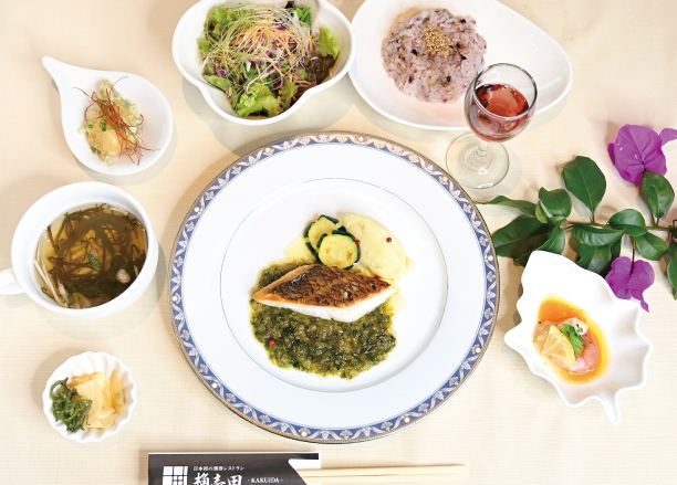 | Menu | ■食前酢 ■前菜 ■サラダ ■桷志田小鉢 ■スープ ■ライス ■黒酢スイーツ ■コーヒー ※仕入れ等の影響により、予告なしに変更になる場合がございます。ご了承くださいませ。 ※ベジタリアンコースのみコース内容が異なります。 |