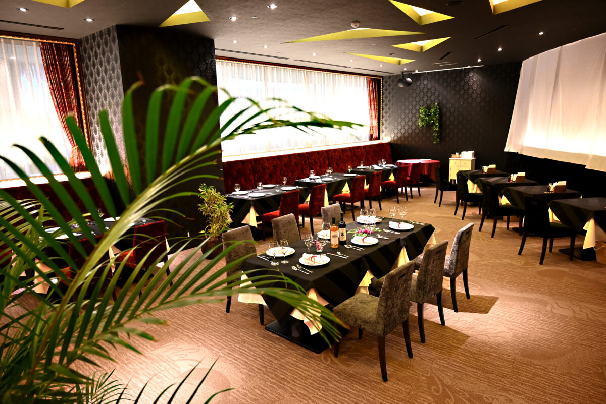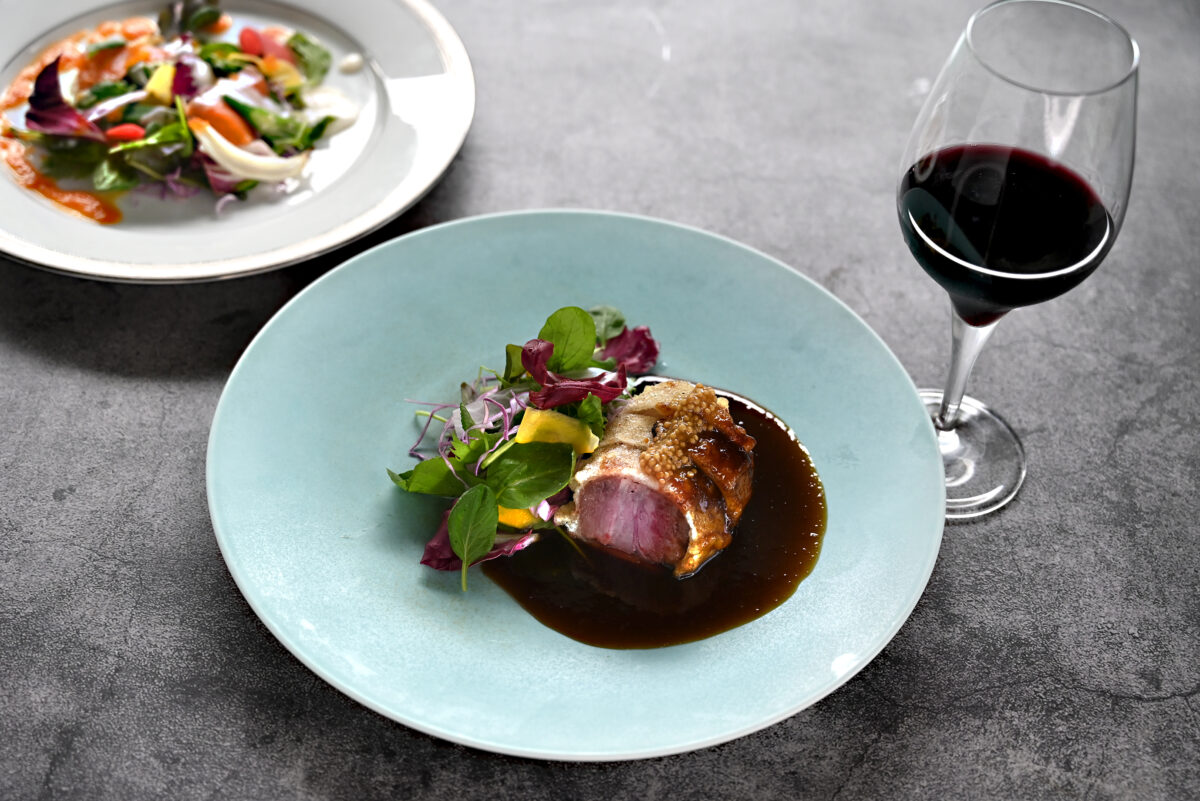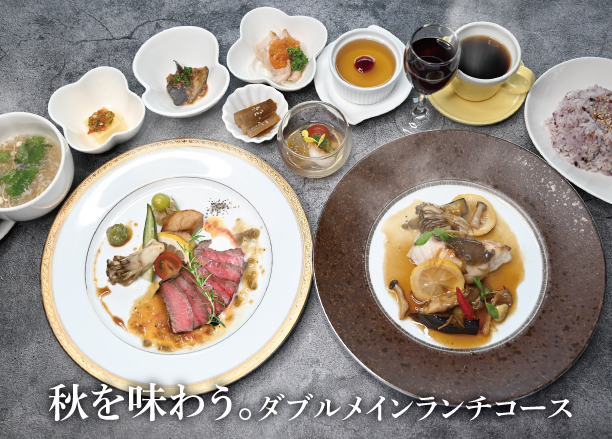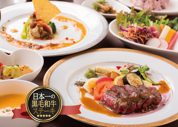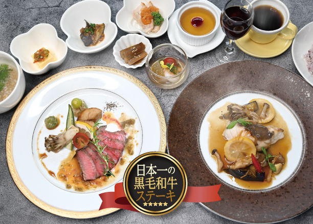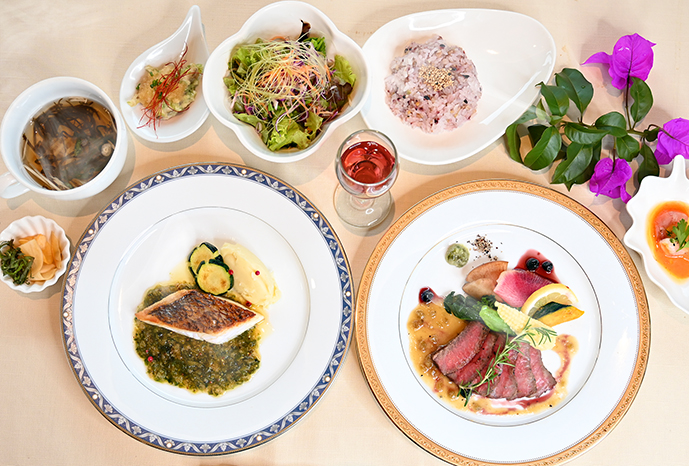 黒酢レストランのフルコースランチ。お肉も、お魚もメイン料理をご用意しています。