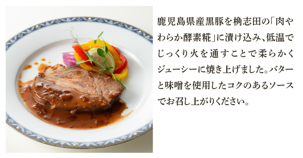 鹿児島県産黒豚を桷志田の「肉やわらか酵素糀」に漬け込み、低温でじっくり火を通すことで、柔らかくジューシーに仕上げました。