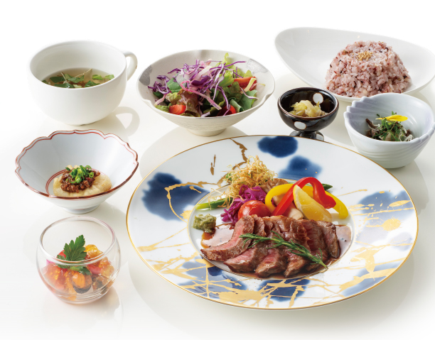 - 食前酢、前菜、サラダ、桷志田小鉢、スープ、ライス、黒酢スイーツ、コーヒー