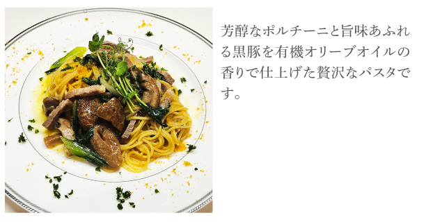 ポルチーニと黒豚の有機オリーブオイルパスタ