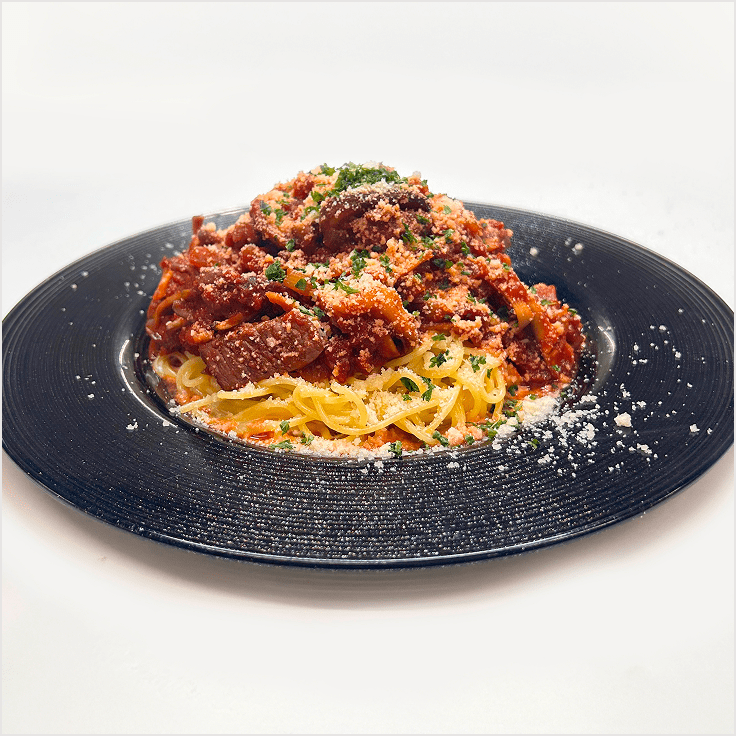 放牧黒毛和牛をじっくり煮込み、旨みが溶け込んだトマトソースに季節の野菜をたっぷりと。トマトのやさしい酸味に、黒酢のまろやかなコクが寄り添い、チーズの濃厚さを引き立てます。満足感がありながらも後味はすっきり。ご褒美時間にふさわしいパスタです。